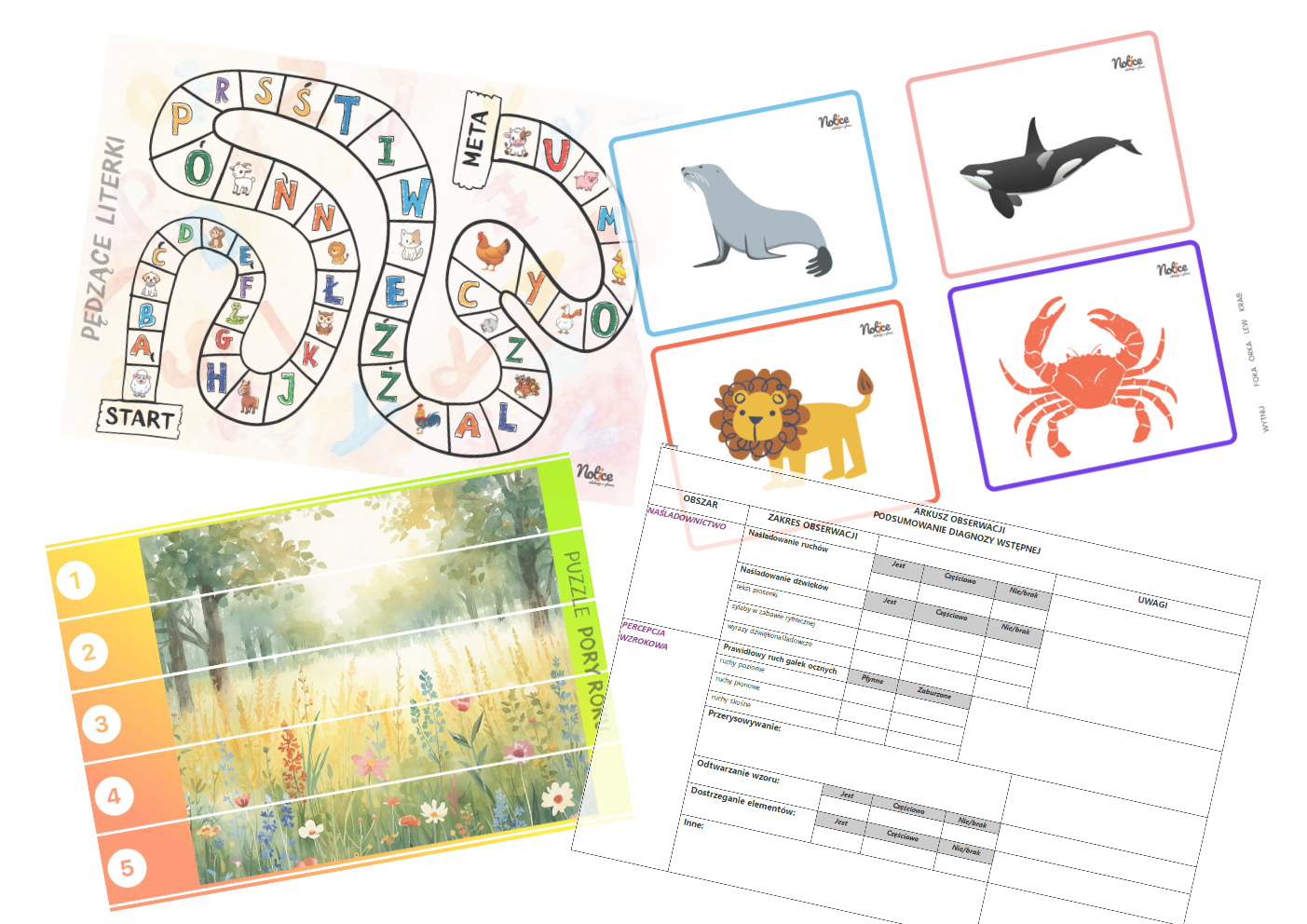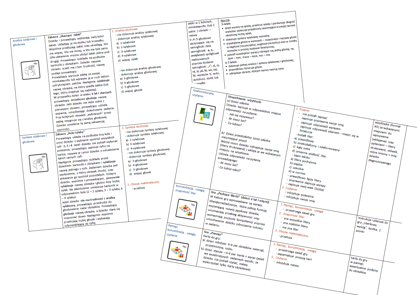 (m.in. gra ,,Pędzące literki”, kolorowanka wg wzoru, puzzle ,,Pory roku” w 2 wersjach, wizytówki, zabawa rytmiczna z podkładem muzycznym, gra ,,Pamięć” , obrazki do zabaw słuchowych , etykiety do zajęć, karty ewaluacyjne dla dziecka)